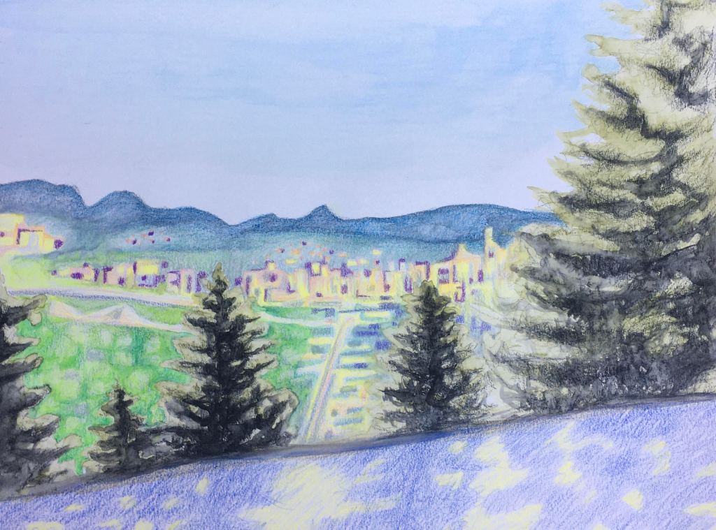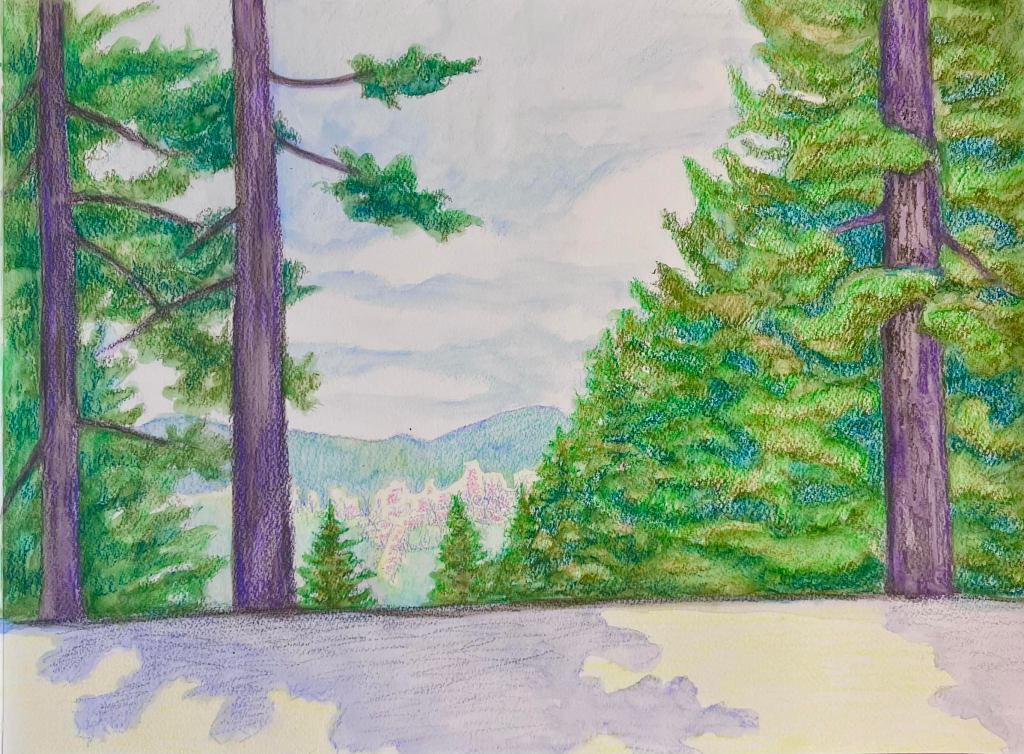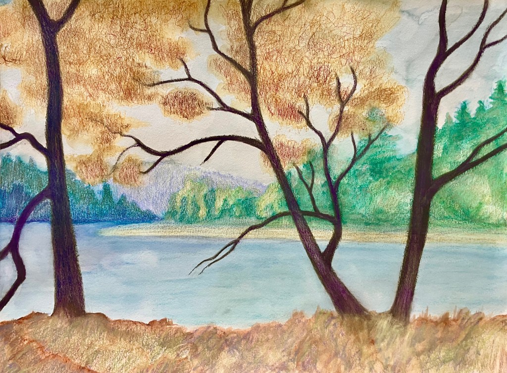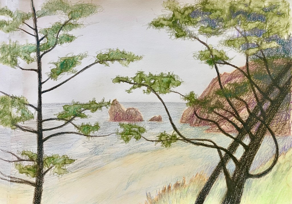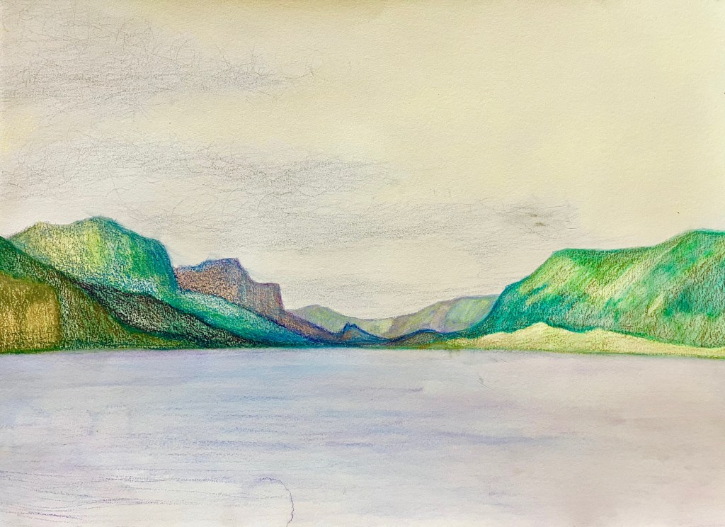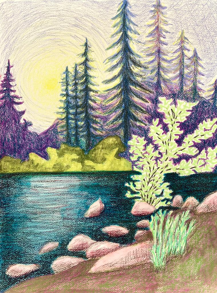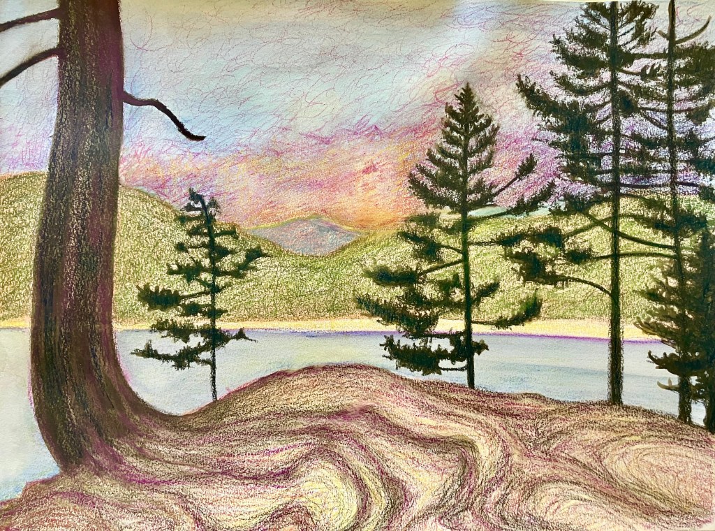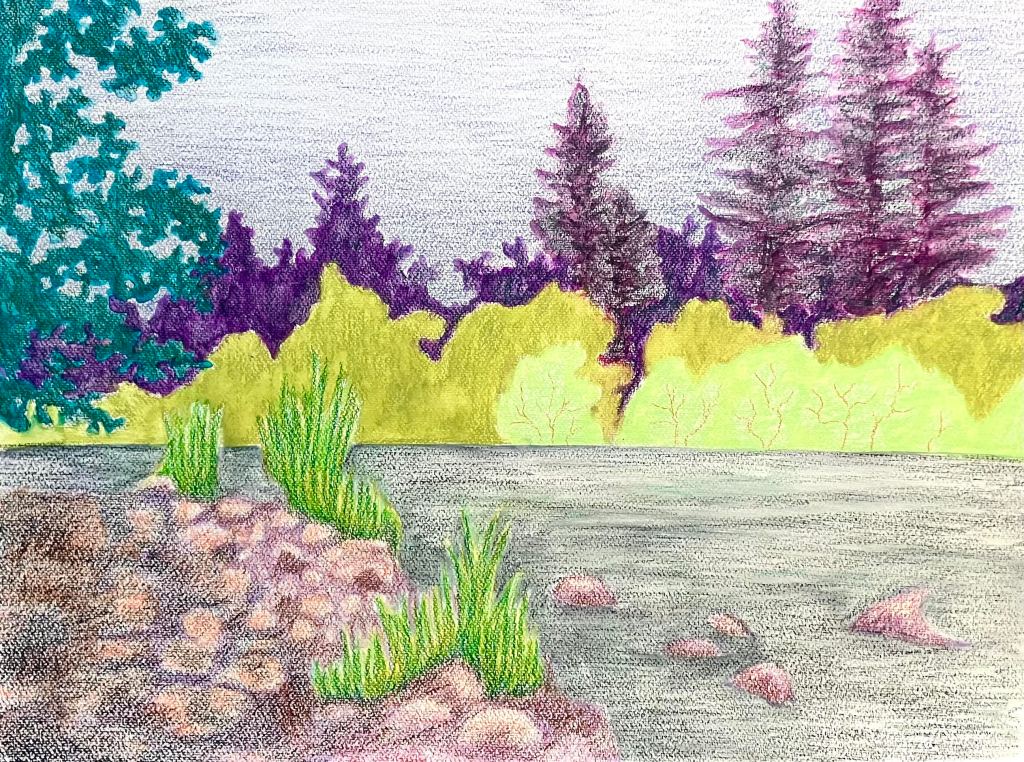 Her other love, landscape painting, has been something that has always come very naturally to her. She studied more traditional painting in highschool but set it aside for many years to focus on abstract work and only returned to it as a form of therapy to heal from traumas, like her long cancer journey. Sitting quietly in nature exploring deep listen and emotional seeing through drawing has been a path back to her spiritual practice.